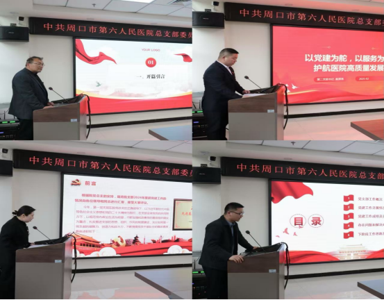 會議上首先進行“第一議題”學習,由岳新建書記領學習近平總書記《在黨的二十屆三中全會第二次全體會議上的講話(節(jié)選)》,隨后各黨支部書記向大會逐一進行現(xiàn)場述職,全面總結(jié)2024年度黨建工作開展情況,深入查找存在的問題和不足,明確下一步工作思路。會議最后傳達學習了周口市衛(wèi)健委黨組書記、主任胡國勝同志在基層黨組織書記述職評議會上的講話精神。最后,院長、總支部書記分別對各支部書記工作情況進行點評,給予了充分肯定的同時也指出存在問題和不足之處。